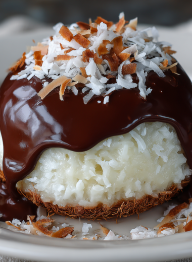 This Coconut Dome with Chocolate features a luscious blend of creamy coconut and rich chocolate, creating a delectable dessert that complements any celebration with its elegant appearance and delightful texture.